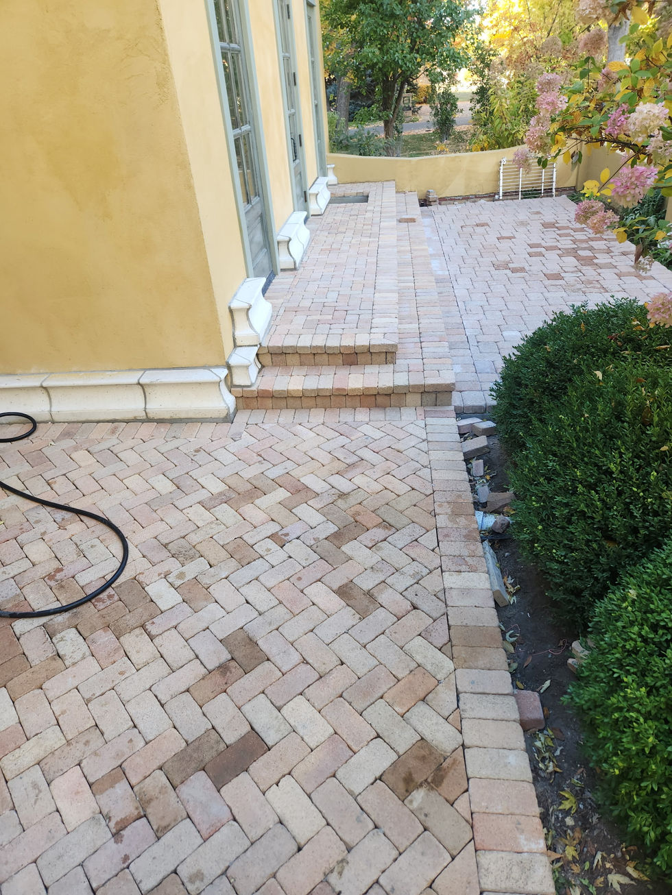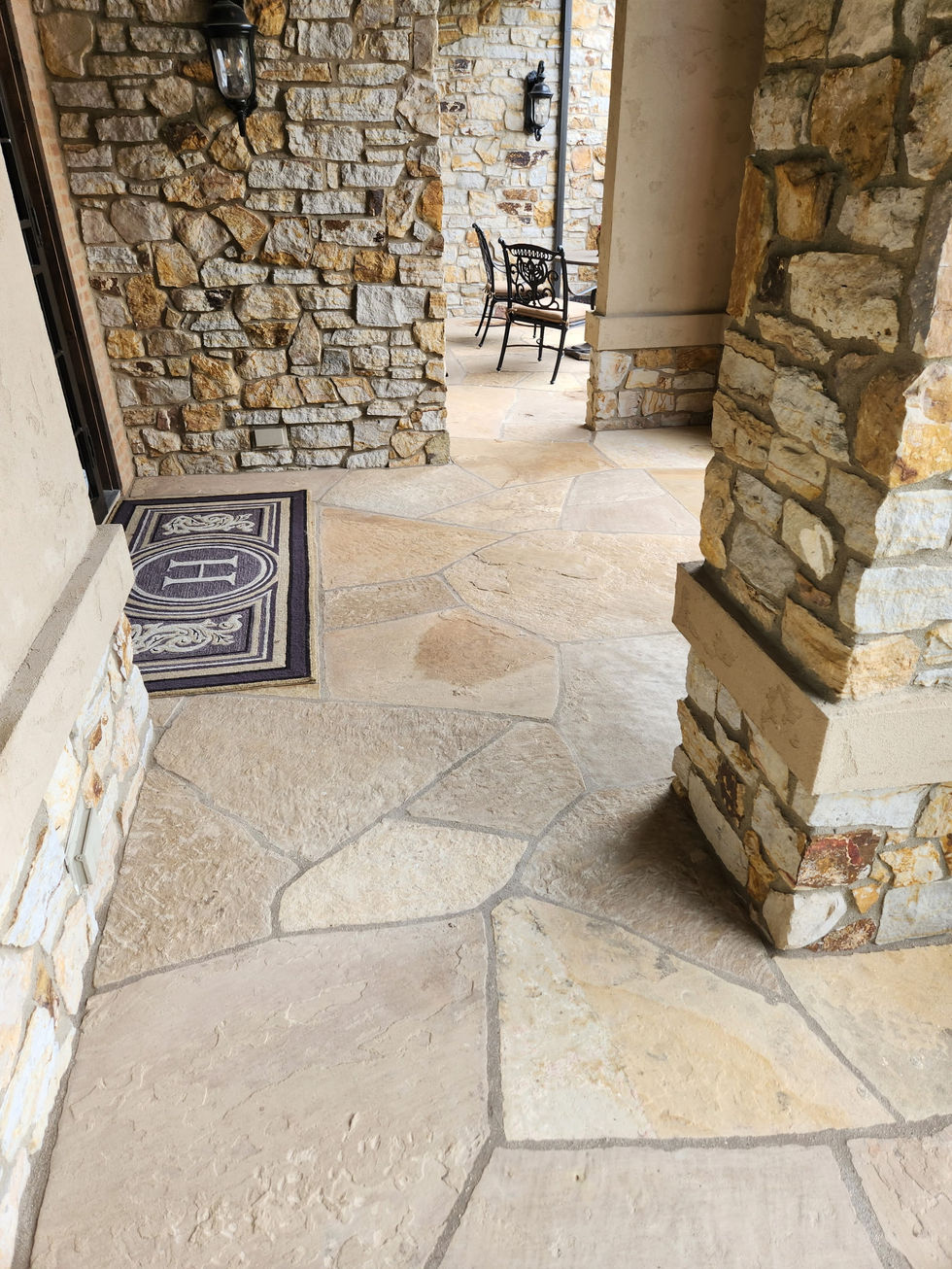This project showcases elegant stone pathways, brick patios, and outdoor furniture. The images capture the beauty of outdoor spaces with decorative mats, metal supports, and surrounding greenery.